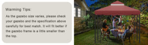 - ⛺【Easy to Install】This is a 119″x119″ canopy replacement top for a 303cmx303cm 2-tier gazebo frame. Our canopy top replacement will fit perfectly with 9.94*9.94ft tents. Lightweight, environmentally friendly materials, easy to use and store. Velcro straps can be easily installed and secured to the gazebo.