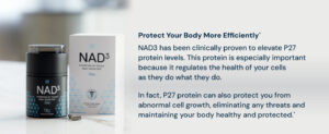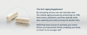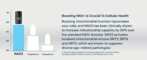 • BENEFITS OF NAD(3) – NAD(3) impacts all the key areas of cell health: It boosts NAD+ the crucial co-enzyme for Mitochondrial function. Activates Sirtuins, the healthy-aging and survival protein. Increases Telomerase activity to protect DNA. And influences NLRP3 expression to control cellular health